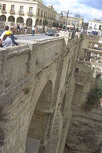 Grandios erhebt sie sich auf dem Felsen, geteilt durch die spektakuläre Schlucht, die der Fluß Guadalevín in Jahrtausenden aushöhlte. Das Wahrzeichen der Stadt ist der Puente Nuevo (die "neue Brücke"), der das Alte Ronda und das Moderne Ronda über den tiefen Graben miteinander verbindet.